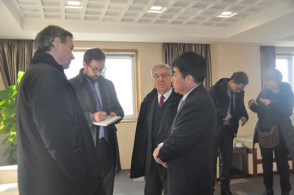 2016年11月22日,由歐盟環(huán)境委員維拉(部長級)率領(lǐng)的歐盟代表團,在歐盟駐華大使史偉(副部長級)的陪同下,一行16人,頂著入冬的第一場雪參訪華新環(huán)保與我公司總經(jīng)理王建明親切會見,并進(jìn)行座談。
